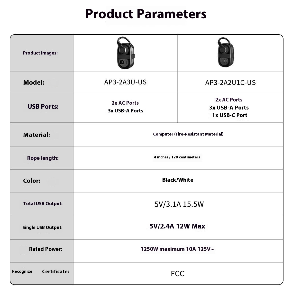 - Style Options:US Standard: 2 AC Ports + 2 USB Charging PortsUS Standard: 2 AC Ports + 3 USB Charging Ports