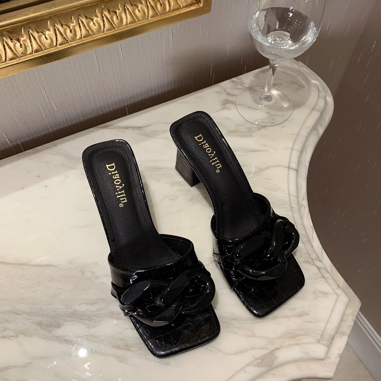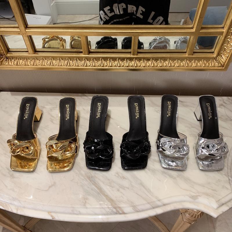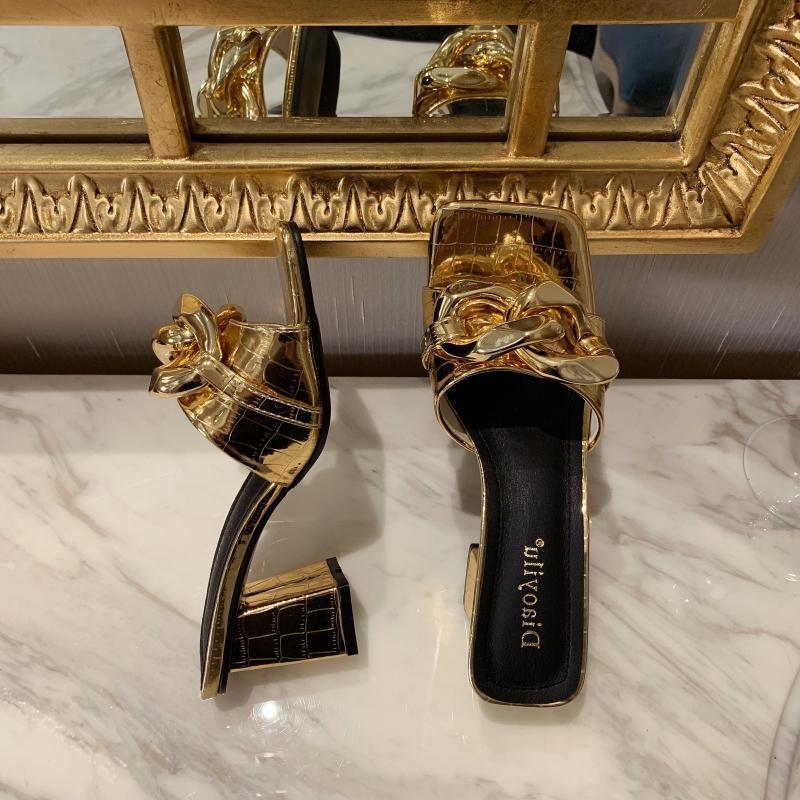 Coarse Heel Stone Pattern Chain Golden Sandals Slippers Women