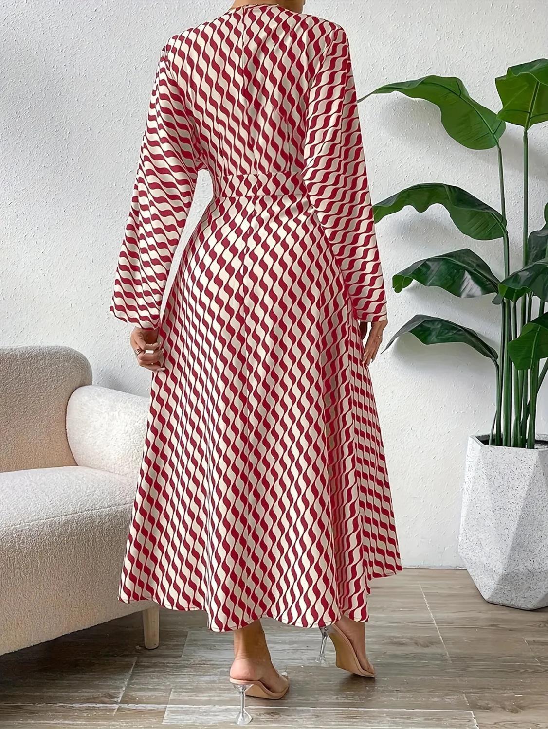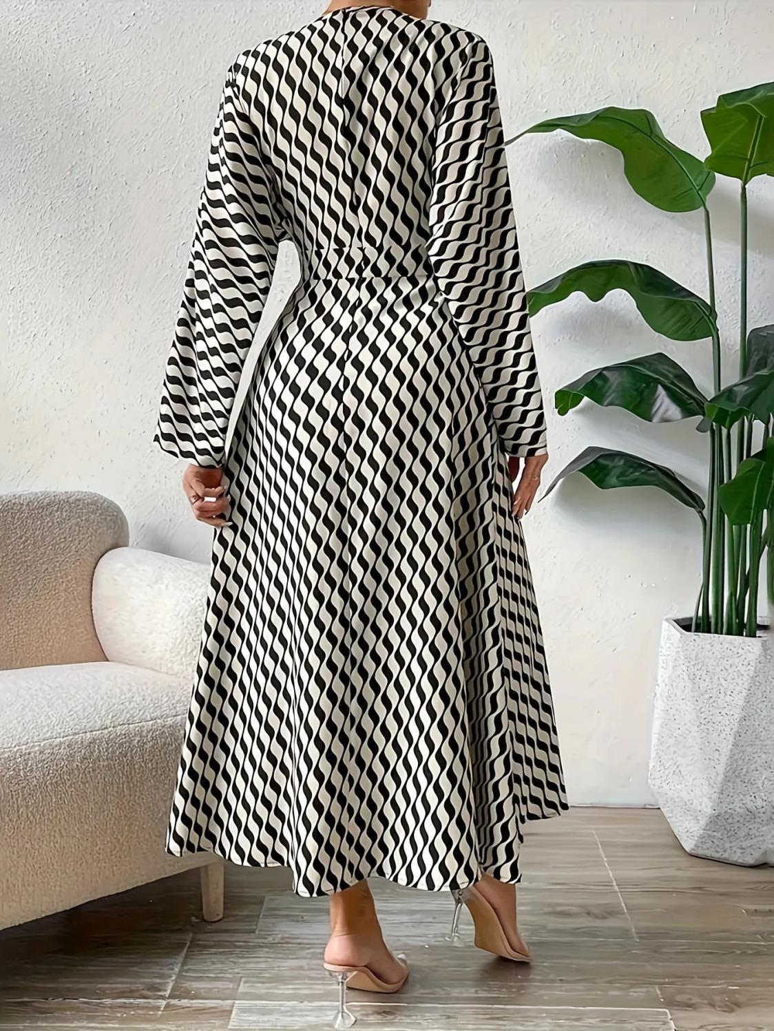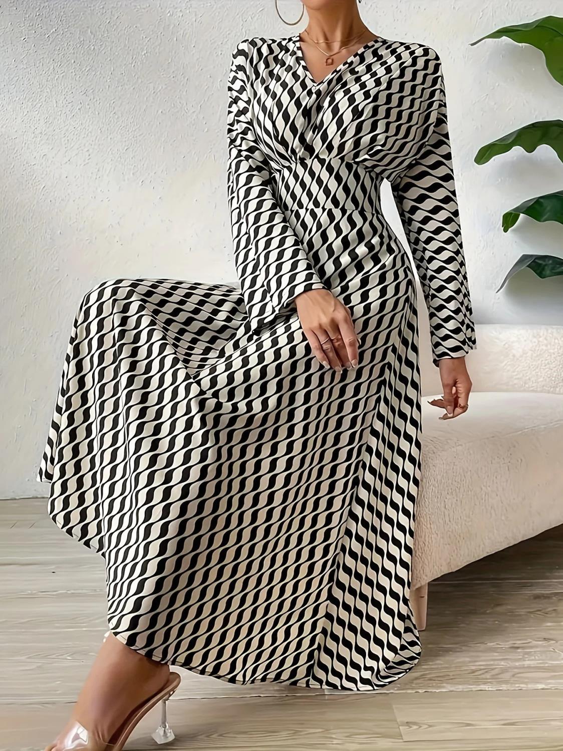 Geometric Printed V-neck Long-sleeved, Cinched-waist Elegant Office Clothing