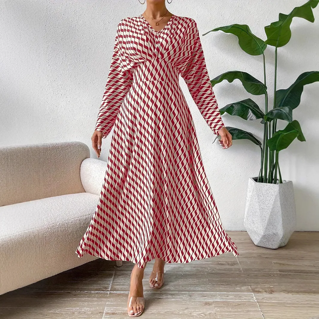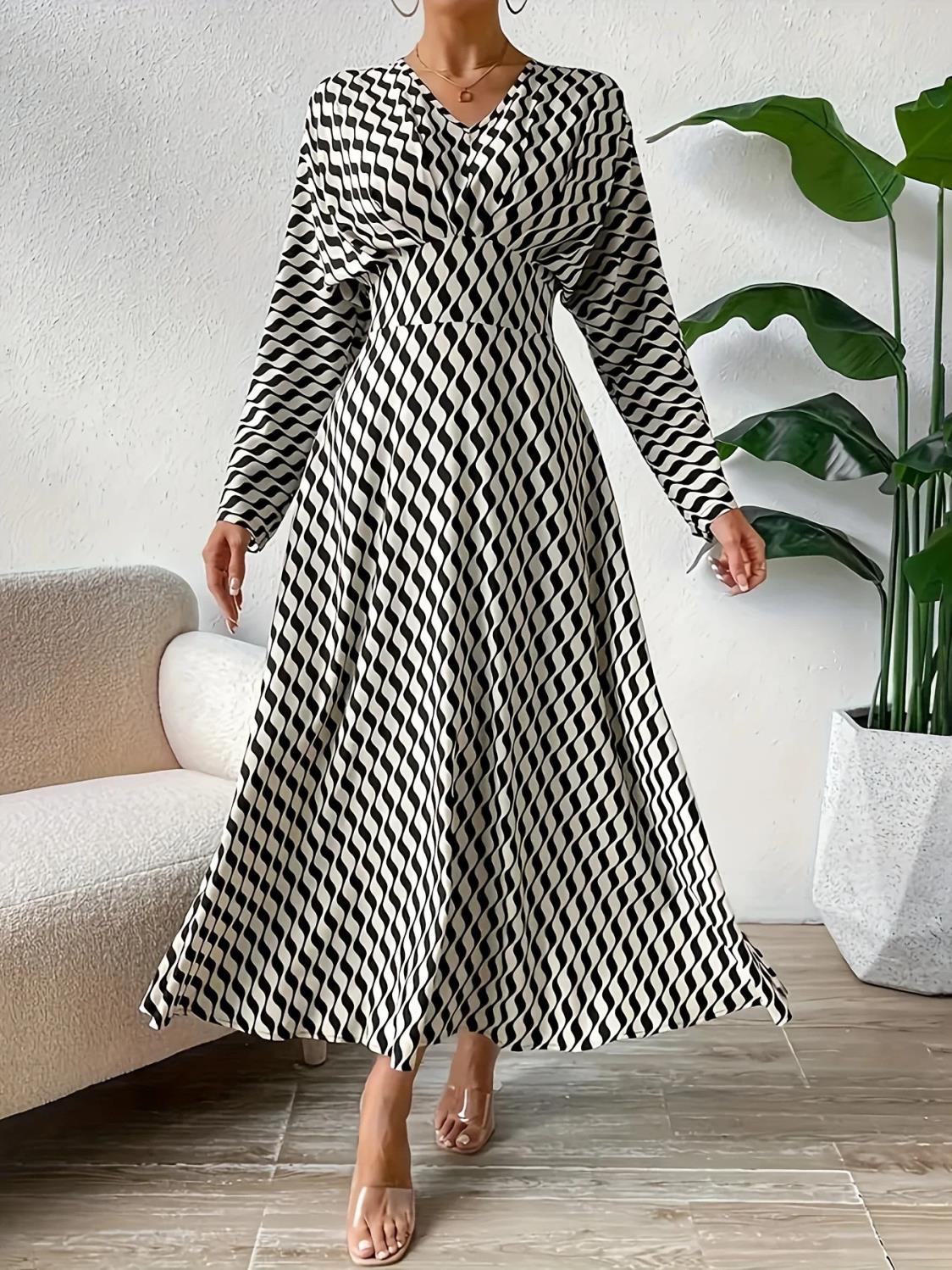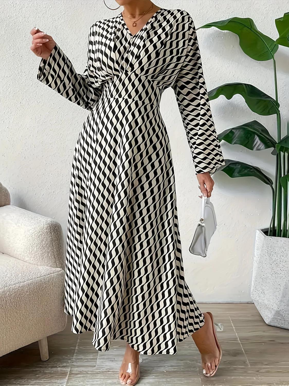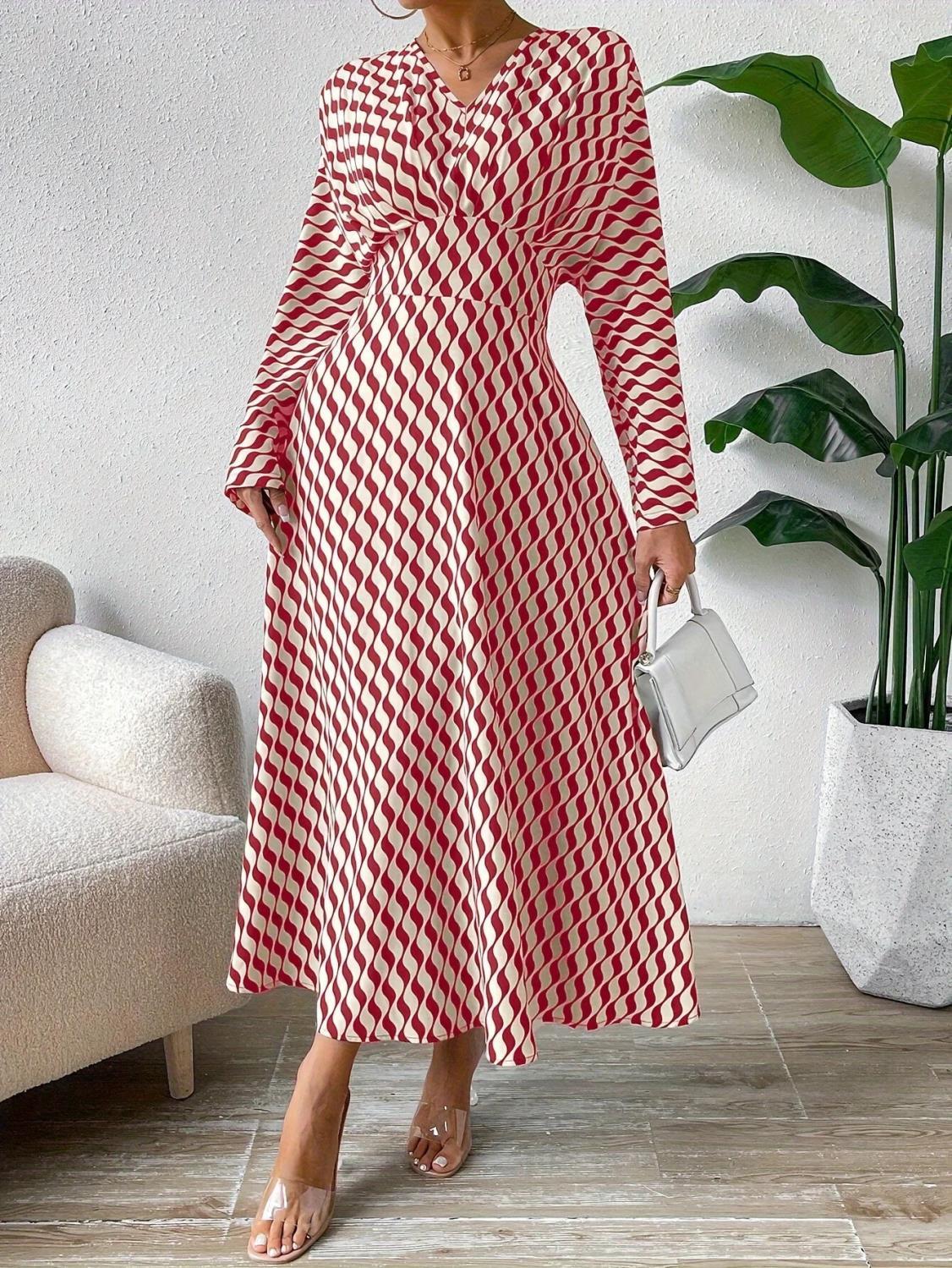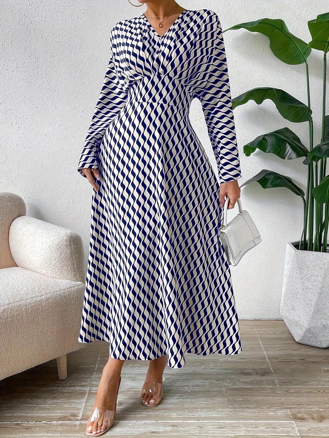 Elevate your office wardrobe with our Geometric Printed V-neck Long-sleeved Cinched-waist Dress. This elegant piece combines style and comfort, making it perfect for the modern professional woman.
