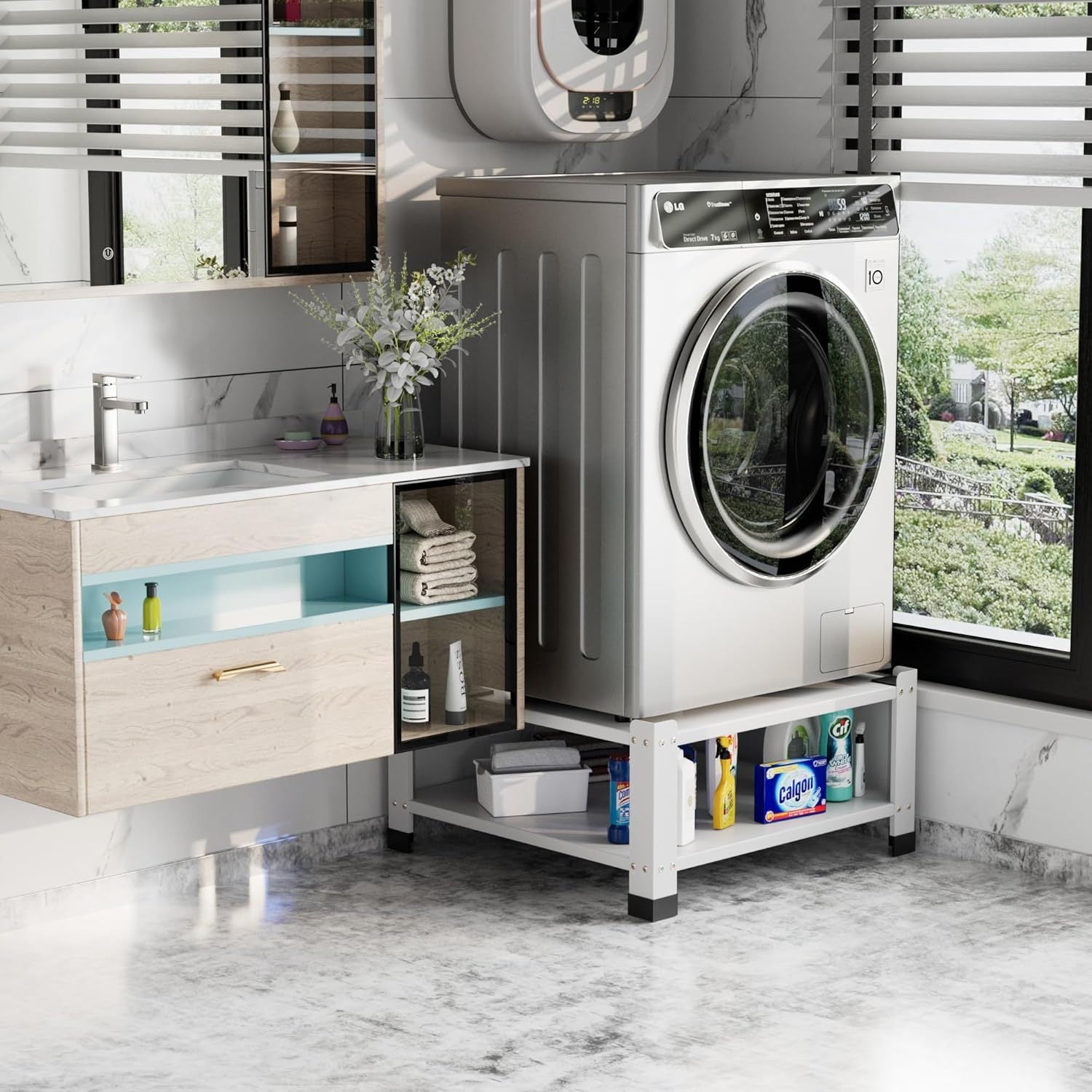 - [FUNCTIONAL DIVERSIFICATION] Our laundry pedestal comes with a storage shelf for laundry baskets and other items. There are also 4 shock-absorbing pads on the top and 4 on the bottom to minimize noise.