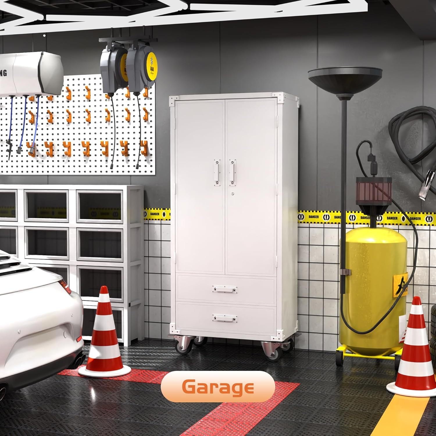 Rolling Storage Cabinet With 2 Doors And 2 Drawers, Metal Storage Cabinet With Doors And Shelves, Locking Steel Cabinet For Warehouse, Home, Office White