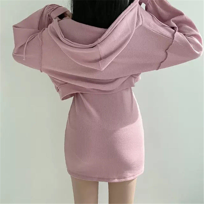 Women Solid Set High Waist Slim Mini Dress Hooded Zipper Short Long Sleeve Sweater Cardigan Suit