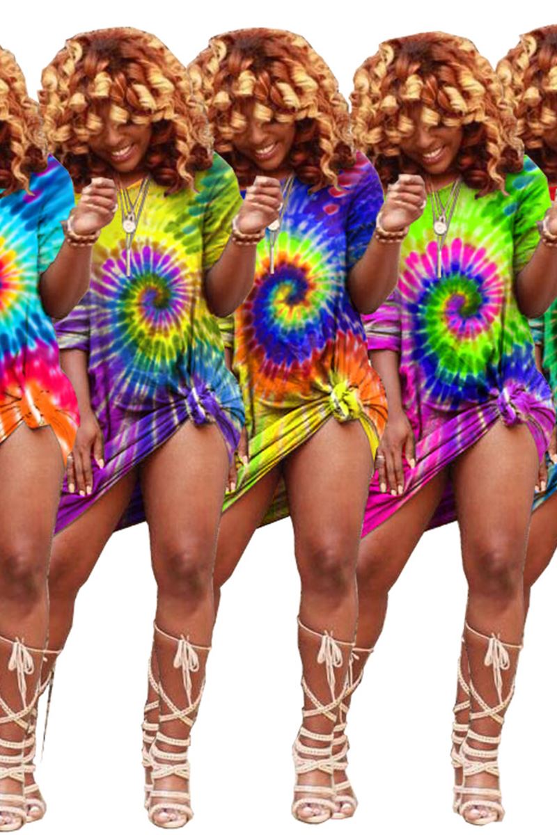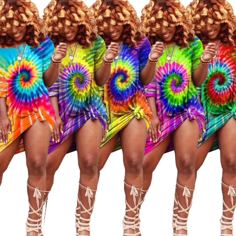 Women Tie Dye Print O-neck Short Sleeve Loose Straight Mini Dress Sexy Party Club Bandage Knee Length Oversize Pencil Dress D30